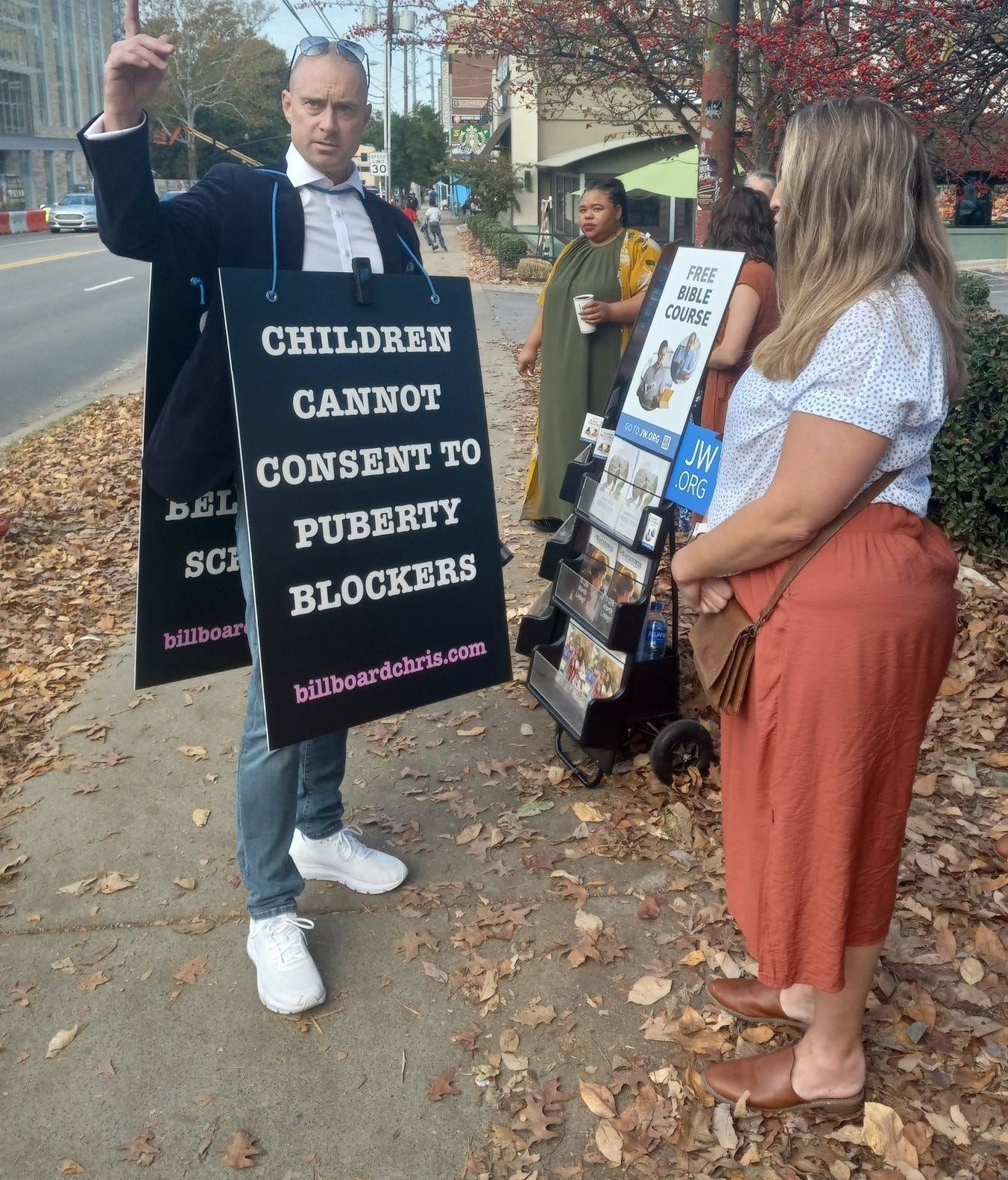 The three of us — me, Chris, and Dr. Wright — observed an example of that phenomenon at the very entrance of the campus. We were still on the public sidewalk when an individual ran up behind Chris and, as I watched, placed Their phone an inch from his nose, denounced him as “evil,” and then accused Chris of assuault when he gently pushed their hand away from his face. Thereafter, they tried to cover up the camera he wears on his sandwich board.