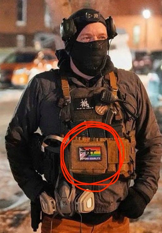 Laugh if you wish, but here is the kind of person who responded to Wagner’s message and showed up for the street party all crazy-coded. Perhaps he is in Flanagan’s secret justice-obstruction Signal group. The patch in the red circle reads: “DEFEND EQUALITY”, but the message the man is sending here is that he is crazy enough to shoot you with an assault rifle over somebody’s preferred pronouns.