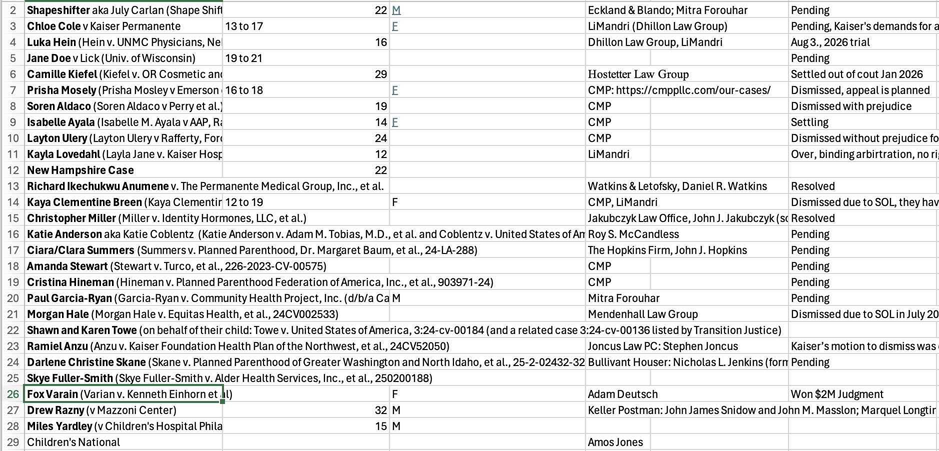 I’m waiting for a late-night TV ads legal firms pursuing suits against gender clinics and doctors country-wide.