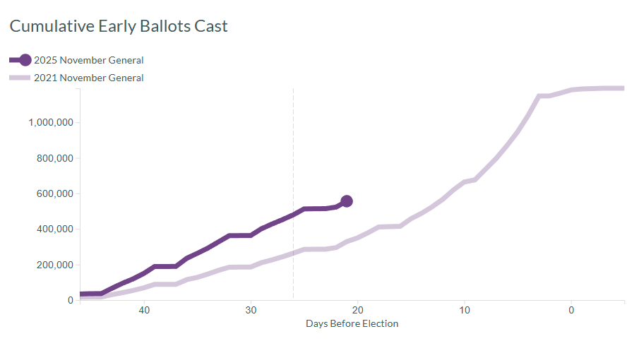 According to the bipartisan nonprofit Virginia Public Access Project (VPAP), at the time of this writing, early ballot collection from 23 September 2025 until the first weel of October was almost twice the record level set in 2021. Early ballot submissions are currently still running almost 60 percent higher than four years ago, with a notable uptick this week that maintains the trend. Their data also suggests a very high turnout in the exurban counties of Virginia, places that the state’s colleges give less weight in their own polls, which consistently show Abigail Spanberger leading by double digits.