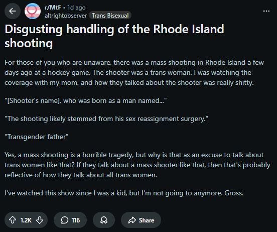 Speaking to reporters remotely in the immediate aftermath of the shootings, Staff Sgt. Kris Clark of the RCMP referred to Strang/Van Rootselaar as a “gunperson” and refused to share his name for “privacy reasons”. Answering a reporter’s question that used male pronouns, Deputy Commissioner Dwayne McDonald called the shooter “female” because “we identify the suspect as they chose to be identified in public and on social media.”