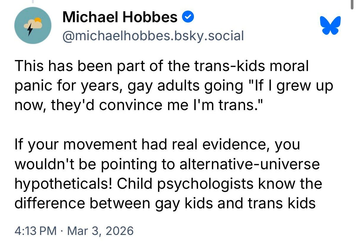 The reason why present-day gay adults have credibility when they say ‘That would be me’ is because we have tons of data that ‘trans kids’ are actually mostly just gay kids, if you leave them alone. Hobbes waves all this away with the assertion that “Child psychologists know the difference between gay kids and trans kids”, which is simply false. And we can prove that it is false.