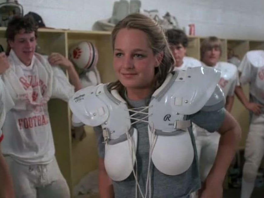 Awkward locker room moment from the made-for-TV movie Quarterback Princess. Sadly, the sequence where Helen Hunt sews the knee pads onto her shoulder pads with her mom’s help has no training montage song because those were not invented until Rocky IV in 1985